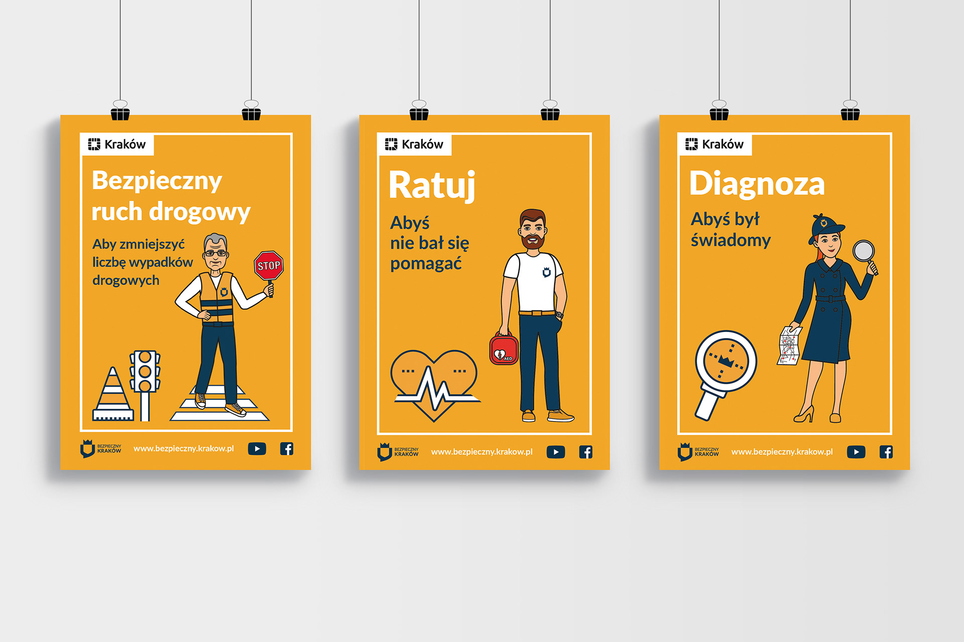 Projekt postaci i plakatów dla Bezpiecznego Krakowa